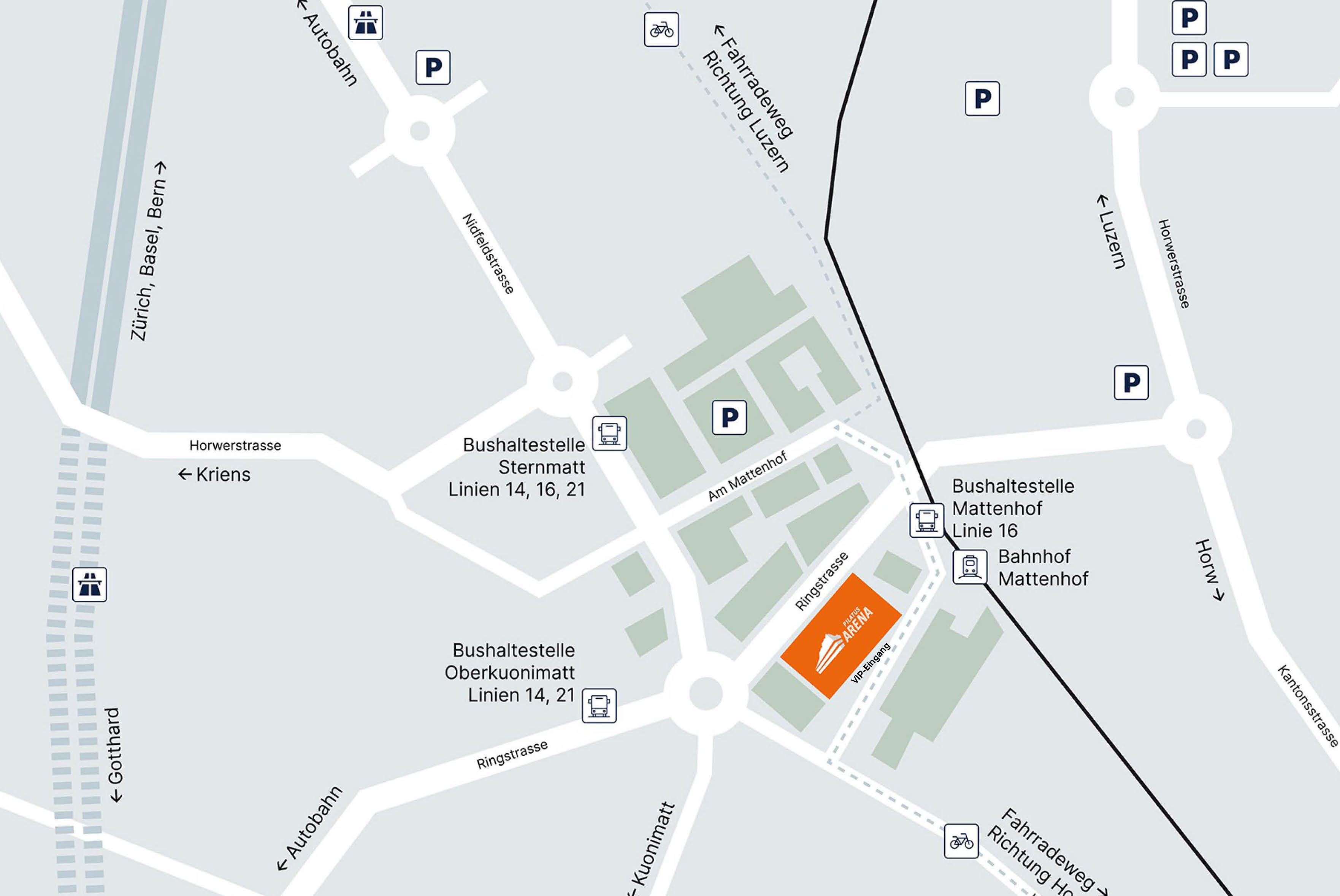 Wir empfehlen dir mit dem öffentlichen Verkehr anzureisen. Die Benützung des öV's im Tarifverbund Passepartout (2. Klasse, alle Zonen) ist jeweils drei Stunden vor und nach dem Spiel im Ticket inkludiert. Vom Bahnhof Luzern bringt dich die S-Bahn im 15-Minuten-Takt innert vier Minuten zur Station «Kriens Mattenhof». Die Pilatus Arena befindet sich eine Gehminute vom Bahnhof Mattenhof entfernt.